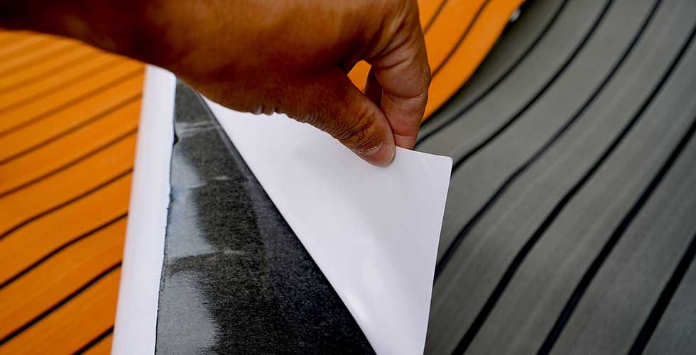Bilteman keinotiikkituotteissa on itseliimautuva taustapuoli, joten tiikin voi kiinnittää alustaan heti. Puhdista kuitenkin työstettävä alue huolellisesti ennen kuin aloitat kiinnityksen. Sitä varten on saatavana sopivia tuotteita, kuten Teak Cleaner -tiikinpuhdistusaine, jotka puhdistavat pinnan tehokkaasti ja poistavat siitä pintajännitystä. Tarvittaessa voit käyttää rasvaa poistavaa asetonia EVA-tiikin tarttuvuuden varmistamiseksi.