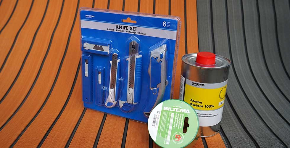 Asetonia peruspuhdistuksen jälkeen - Alustan perusteellisen puhdistamisen jälkeen EVA-tiikkimateriaalin tarttuvuuden voi varmistaa vielä asetonilla.