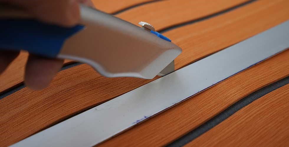 Pitkissä suorissa linjoissa kannattaa käyttää apuna viivainta, ettei leikkauslinjasta tule vino. Jos alueelle tulee saumoja, ne kannattaa mahdollisuuksien mukaan kohdistaa tummien raitojen kohdalle. Silloin saumat saa häivytettyä paljon helpommin. Mikäli teet EVA-tiikistä erillisiä alueita, tulee lasikuidun ja keinotiikin välisestä siirtymästä siistein tumman raidan kohdalla.