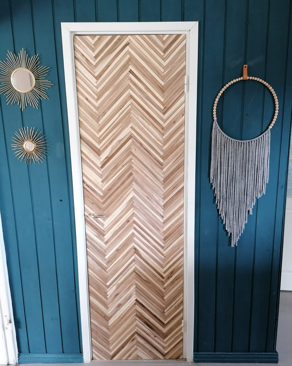 ”Kannustan ehdottomasti kokeilemaan tikuilla tuunaamista, jos vain on lehmänhermoinen ja tykkää näpertelystä. 300 puutikun pussi on edullinen, ja niillä saa näyttävän näköisen pinnan mihin vain. Ovi kiinnittää huomion heti, kun eteiseemme astuu sisälle”, Sainio toteaa hymyillen.