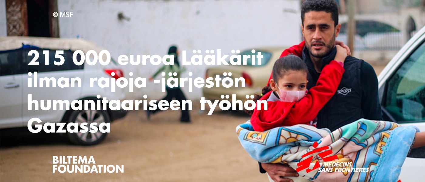Lääkärit ilman rajoja on kansainvälinen, lääketieteellinen ja humanitaarinen organisaatio, joka toimii yli 70 maassa. Se työskentelee jatkuvasti tarjotakseen ihmishenkiä pelastavaa lääketieteellistä hoitoa ja humanitaarista tukea riippumatta ihmisten etnisestä taustasta, uskonnosta tai poliittisista näkemyksistä. Biltema Foundationin lahjoituksella varmistetaan, että Gazan potilaat saavat kipeästi tarvitsemaansa hoitoa ja tukea.